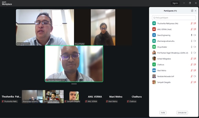 From the University of Peradeniya, the meeting was attended by Prof. B.G.L.T. Samaranayake, Dean of the Faculty of Engineering; Prof. Roshan Ragel, Professor, Department of Computer Engineering; Dr. Panduka Neluwala, Senior Lecturer, Department of Civil Engineering and Faculty Representative to the International Relations Office; Dr. Sampath Deegalla, Senior Lecturer, Department of Computer Engineering; Dr. Achala Pallegedara, Senior Lecturer, Department of Manufacturing and Industrial Engineering; Dr. Chathura Withanage, Senior Lecturer, Department of Manufacturing and Industrial Engineering; and Ms. Thushanika Pakkiyarasa, Project Manager, International Relations Office.