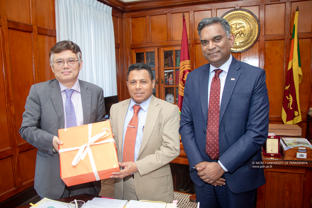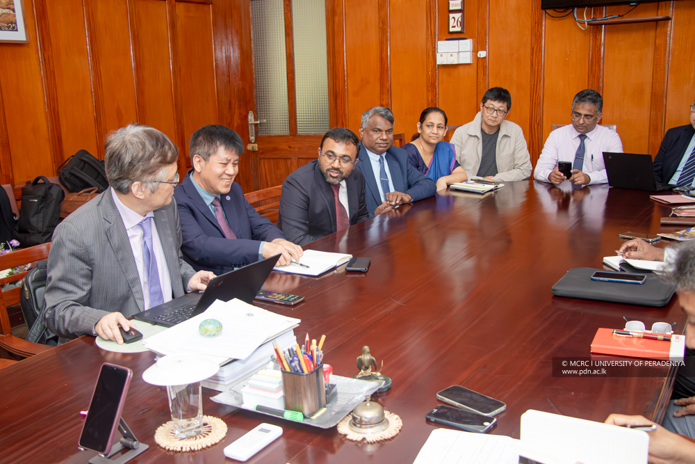 The meeting was held with Prof. Terrence Madhujith, Vice Chancellor of the University of Peradeniya, together with Prof. Sanjeewa Malaviarachchi, Director, International Relations Office, Prof. Anil Wasantha Kalupahana, Dean, Faculty of Veterinary Medicine and Animal Science, Prof. B. M. N. W. B. Balasooriya, Director, Postgraduate Institute of Science, Dr. Madhubhashini Makehelwala, Acting Director, JRDC, Prof. Gamini Rajapakse, Chairman-Research Committee of the JRDC, Dr. Suchitra Weragoda, Former Acting Director-JRDC, Dr. U.K.P.S. Sanjeevani, Scientist, JRDC, Ms. Waruni Edirisooriya, Senior Lecturer, Faculty of Management, and Ms. Thushanika Pakkiyarasa, Project Manager, International Relations Office.